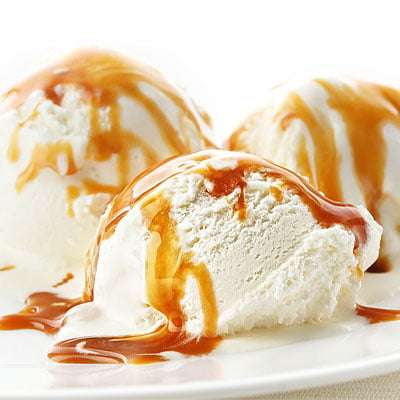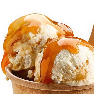 Enjoy caramel ice cream, chopped nuts, chocolate / strawberry dressing.