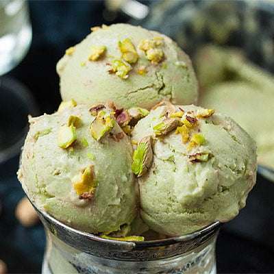 Enjoy pistachio ice cream, chopped nuts, chocolate / strawberry dressing.
