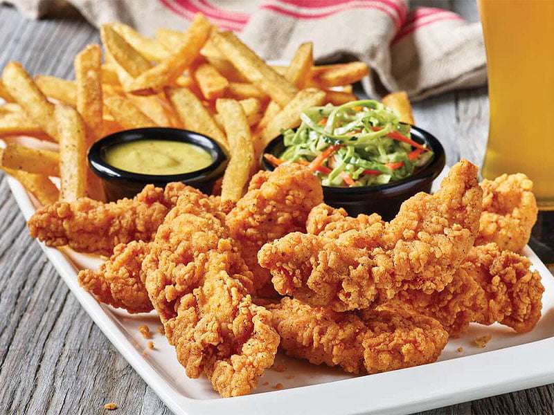 Enjoy tempura fried chicken fillets, french fries, coleslaw salad.