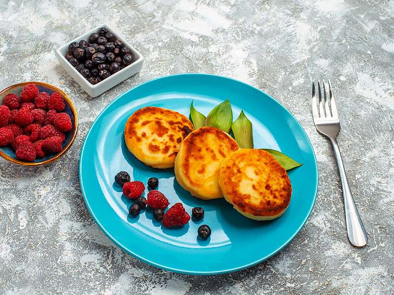 Enjoy fried/cooked cottage cheese medallions (5 pcs.). Served with sour cream and berry sauce (seasonal fresh berries).