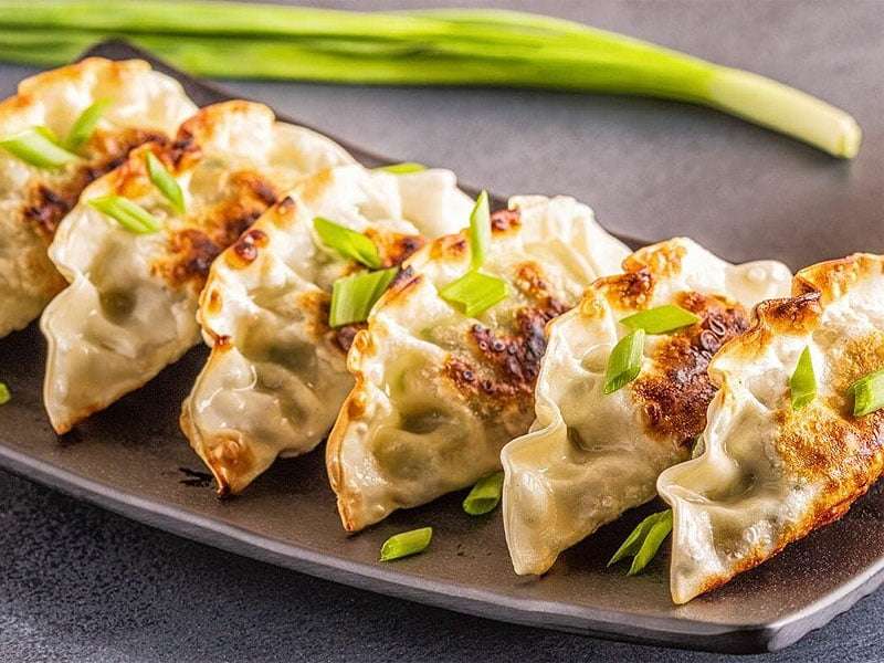 Enjoy dumplings stuffed with cottage cheese/chicken (cooked, fried) (8pcs).