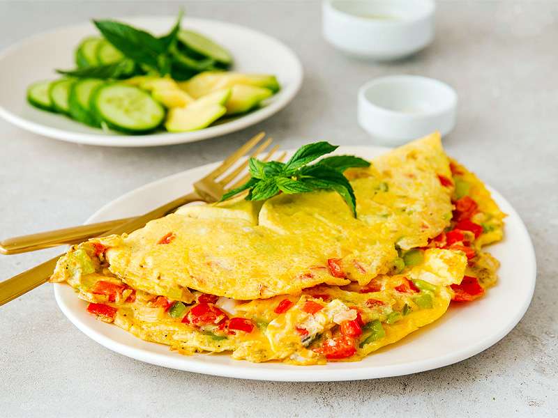 Enjoy three eggs Omelet with spring onions, turmeric, pink Himalaya salt, herbs, and tomatoes served with a paratha (butter-fried flatbread) or toasted Ciabatta bread and butter.