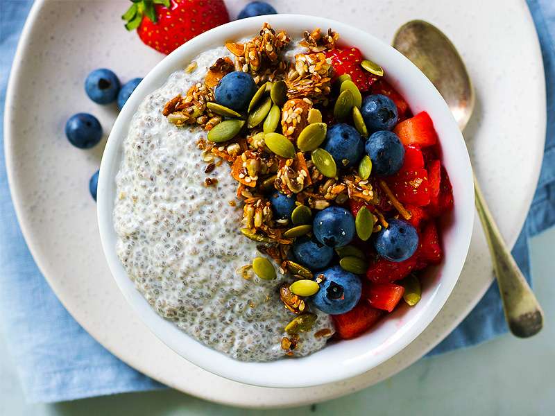 Enjoy spirulina – chia pudding with powdered nuts served with fresh seasonal fruits, and berries.