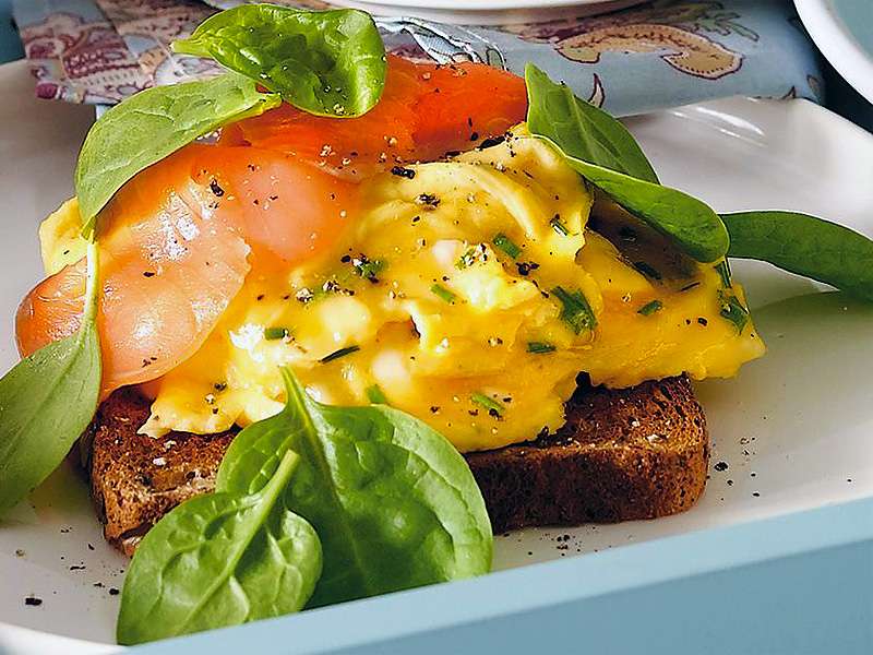 Enjoy black bread smeared with butter and gourmet cheese, two poached eggs, smoked salmon, fresh avocado, arugula, and lettuce salad with a touch of lemon.